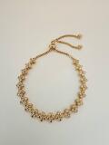 花型のデザインで腕にダイヤ風に輝いたゴールドブレスレットです。カジュアルからエレガントまで対応するデザインです。スライド式のパーツ付きで長さが調整が可能です。 カラー:ゴールド サイズ:スライド式アジャスター